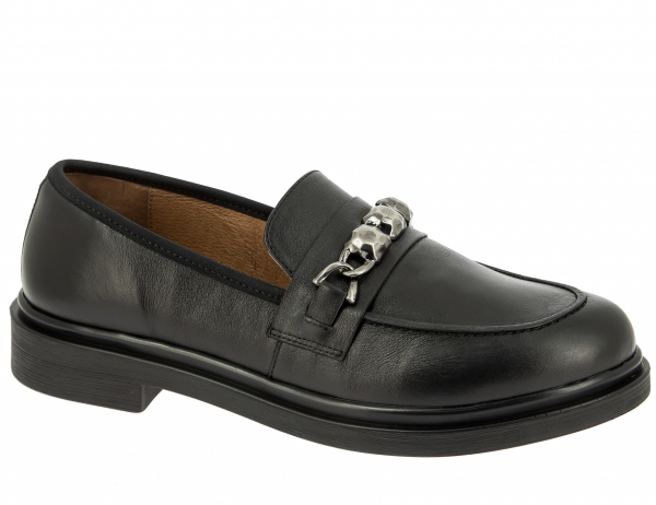 Женские лоферы из новой коллекции воплотили в себе классические линии деловой обуви. Модель изготовлена из натуральной кожи, имеет стандартную полноту и благородный черный цвет. Модель украшена декоративным ремешком в носовой части, что добавляет изысканности этой модели. Лоферы отлично дополняют как деловой образ, так и образ в стиле кэжуал, поэтому фасон универсален и практичен.
