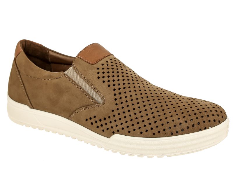 Слипоны мужские RAUL бежевого цвета. Натуральный нубук прочный и долговечный, на нем долго не появляются заломы в местах частых сгибов. Сквозные отверстия перфорации свободно пропускают воздух, в сочетании с кожаной подкладкой это позволяет ногам дышать. Модель не имеет шнурков и застежек, комфортную посадку на разный подъем обеспечивают эластичные вставки по бокам.